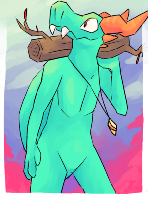 Considering that Llokin may be potentially red/green colorblind, and AEMIL's green scales, it is possible that he blends right into the red foliage of Vetteswoods from a Llokin's perspective.