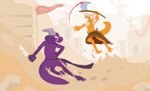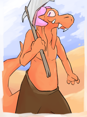 MEAZS is brightly orange scaled, has a pair of distinctive light pink, downward-curling, forward-pointing horns, and has deep purple eyes. He wears a dark brown knee-high skirt, and is sometimes depicted wearing a skull of unknown origin atop his head and a pair of bone-colored pauldrons. He carries a simple axe with a single long blade and a hook on the opposite end, which is described to have inscriptions of ZSUNG. [2]